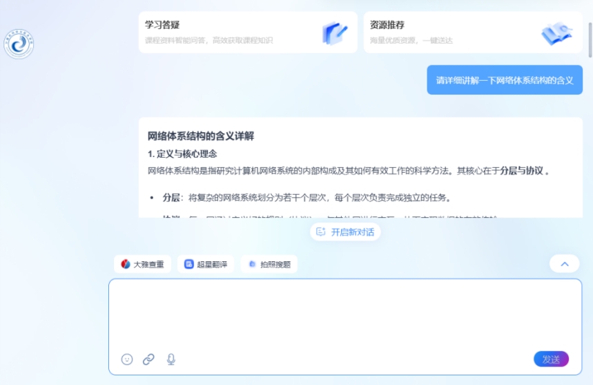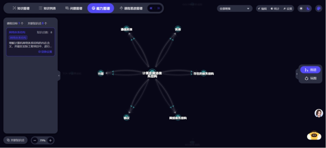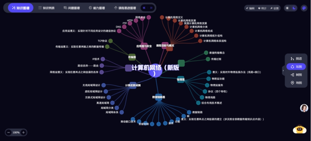 课程团队基于超星泛雅平台,集成DeepSeek-化大小计等大模型能力,打造《计算机网络》智慧课程平台,建立97个知识点、14个知识点资源、1260个教学资源、54个拓展资源,形成知识图谱、能力图谱、课程思政图谱等相关数字资源,为智慧课程建设打下良好的基础。员工可通过自然语言提问,AI助手即时生成可视化解析,员工学习的效率得到大幅度提升。
