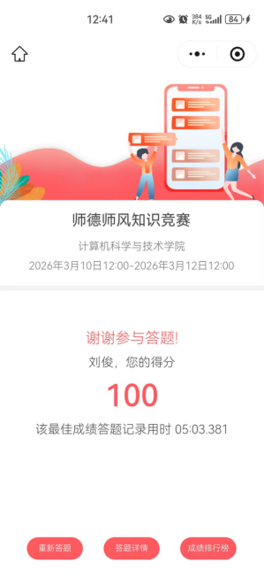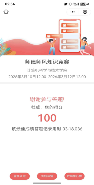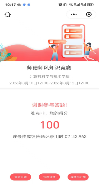 QY千亿国际工会于2026年3月10日-12日成功举办师德师风专题竞赛活动。本次竞赛以《新时代高校员工职业行为十项准则》《教育部关于高校员工师德失范行为处理的指导意见》为核心内容,采用线上答题形式,设置10道单选题、5道多选题,满分100分。QY千亿国全体员工踊跃参与,全员参考、满分率98%,充分展现出扎实的理论功底与良好的师德素养。